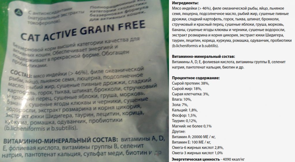 Ознакомимся с составом корма Gina Elite на примере варианта Cat Active Grain Free (для активных кошек), производимого в Канаде. Посмотреть его можно на изображении (кликните по нему чтобы увеличить для удобности чтения):