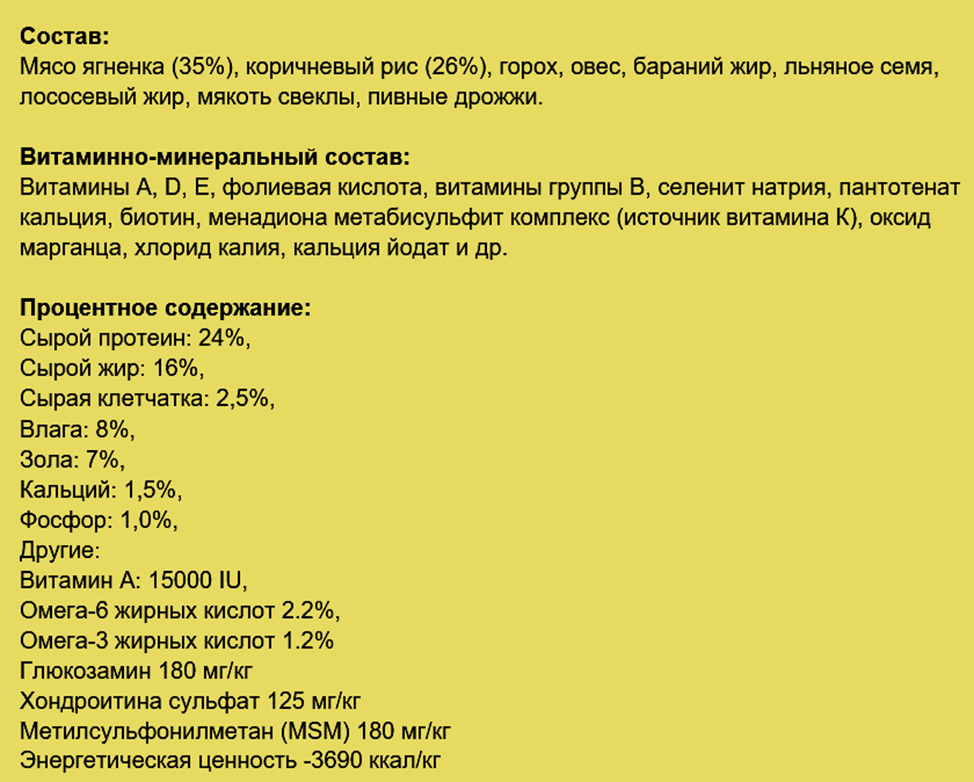 Льняное семя, люцерна, подсолнечное масло и рыбий жир — источники Омега-3 и Омега-6 жирных кислот. Пивные дрожжи богаты витаминами B-группы. Сладкий картофель и горох — источники углеводов. Правда странно видеть их так далеко в составе, учитывая расположение после пивных дрожжей — их максимум пару процентов. А это вряд ли, ведь если суммировать проценты веществ из гарантированного анализа, получиться что углеводов должно быть минимум 20%.