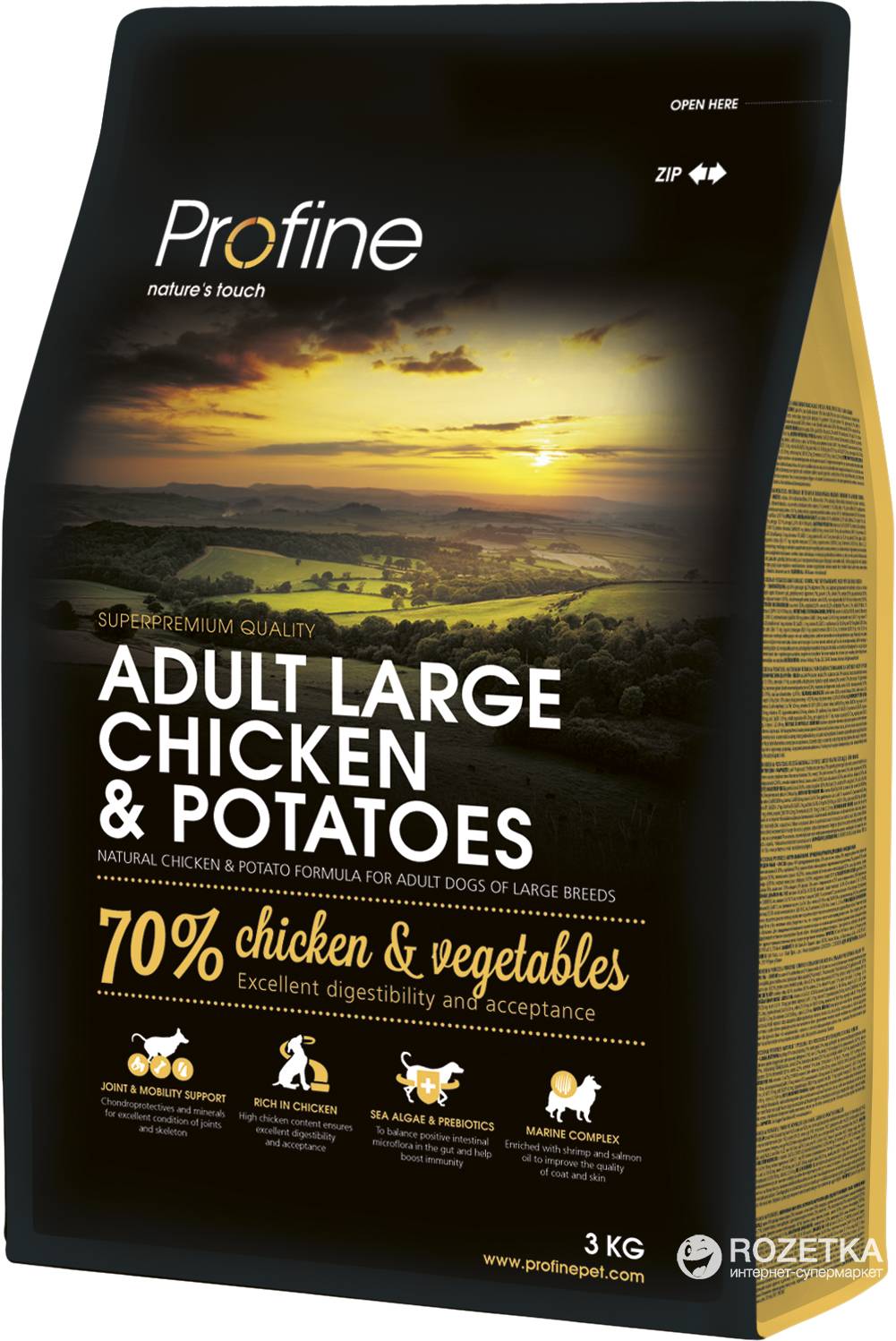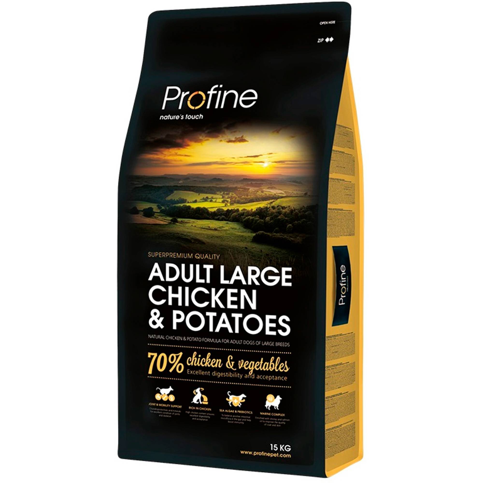 Состав корма Profine рассмотрим на примере повседневного рациона для взрослых собак ADULT CHICKEN & POTATOES. Преимущества, которыми оперирует производитель: