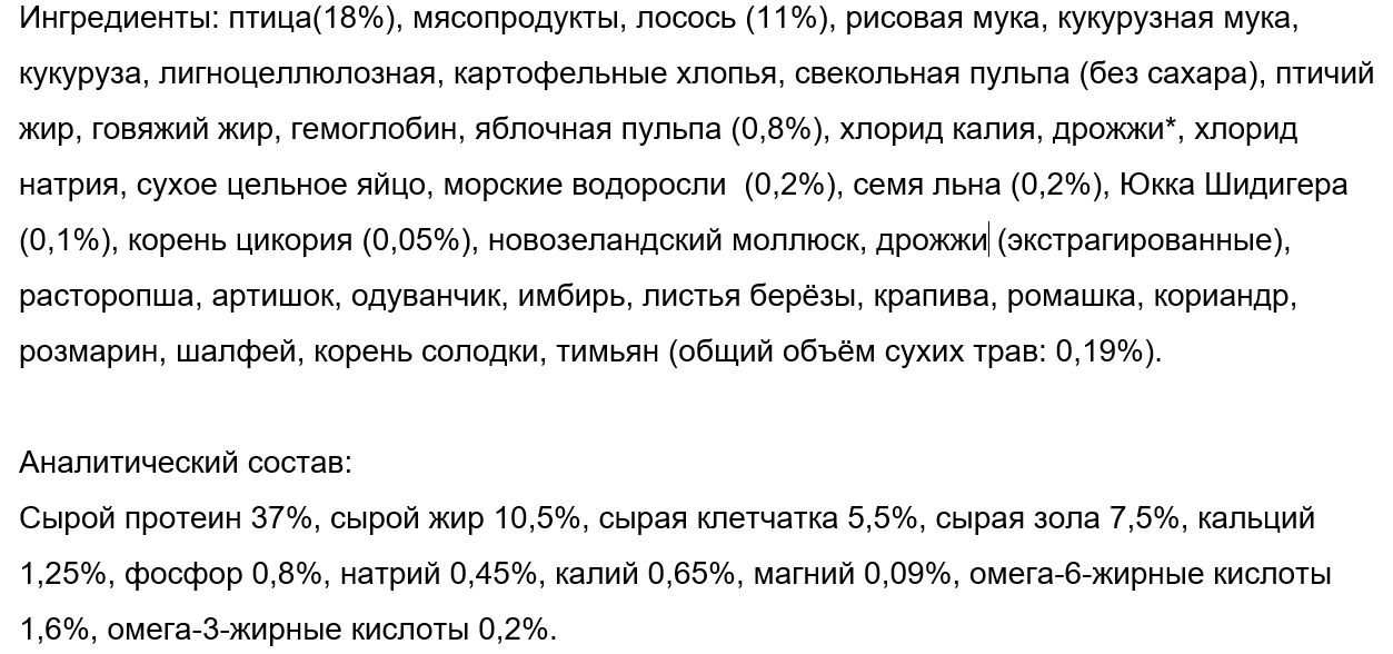 Первый ингредиент — птица (21%). Не понятно что именно за птица и какие её части. 21% немало, но возле этого ингредиента нет символа *, как возле других высушенных мясных компонентов. Отсюда можно сделать вывод, что «птицы» 21% в сыром виде, а после приготовления в сухом корме процент будет в 3-4 раза меньше.