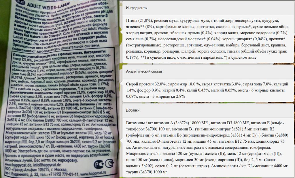 Изучим состав корма Happy Cat на примере варианта Adult Weide-Lamm (Пастбищный Ягненок, для всех взрослых кошек). Его можно увидеть на изображении ниже (для удобности чтения кликните левой кнопкой мышки по изображению):