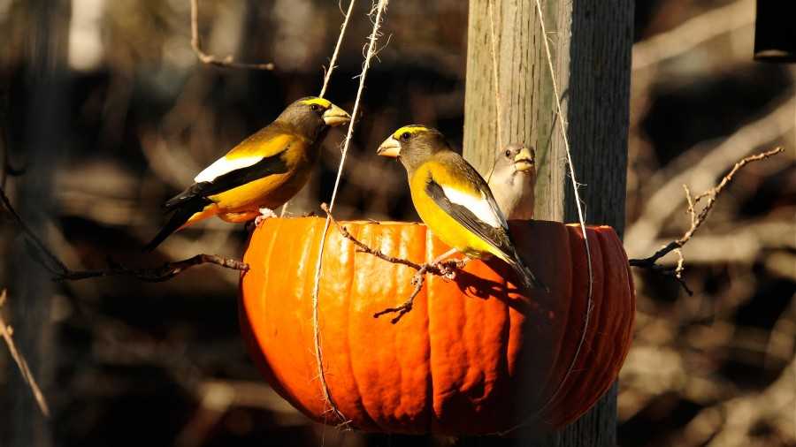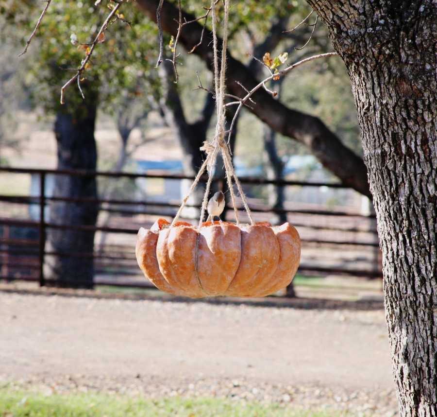 Если не поленитесь можете украсить кормушку любыми украшениями, чтобы привлечь внимание пернатых. Подвесить такую столовую можно за хвост тыквы, а также можете использовать обычную веревку.
