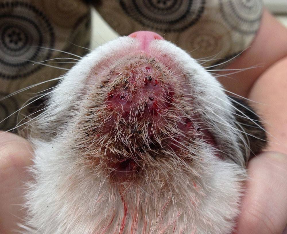 Достаточно часто болячки на морде у кота появляются в ответ на смену питания