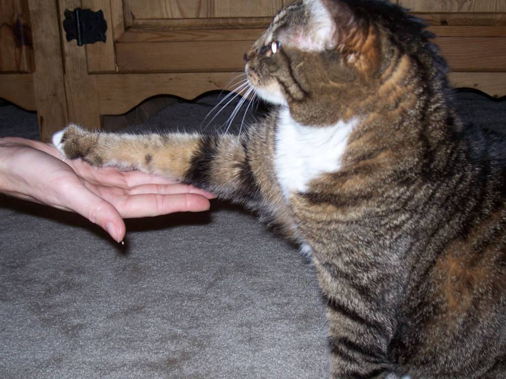 А далее все просто. Нужно приманивать кошку лакомством, а когда она сделает то, что от неё требуется, то тогда наградить её этим лакомством. Также дополнительно можно погладить и почесать за ушком. В общем, всячески хвалить.