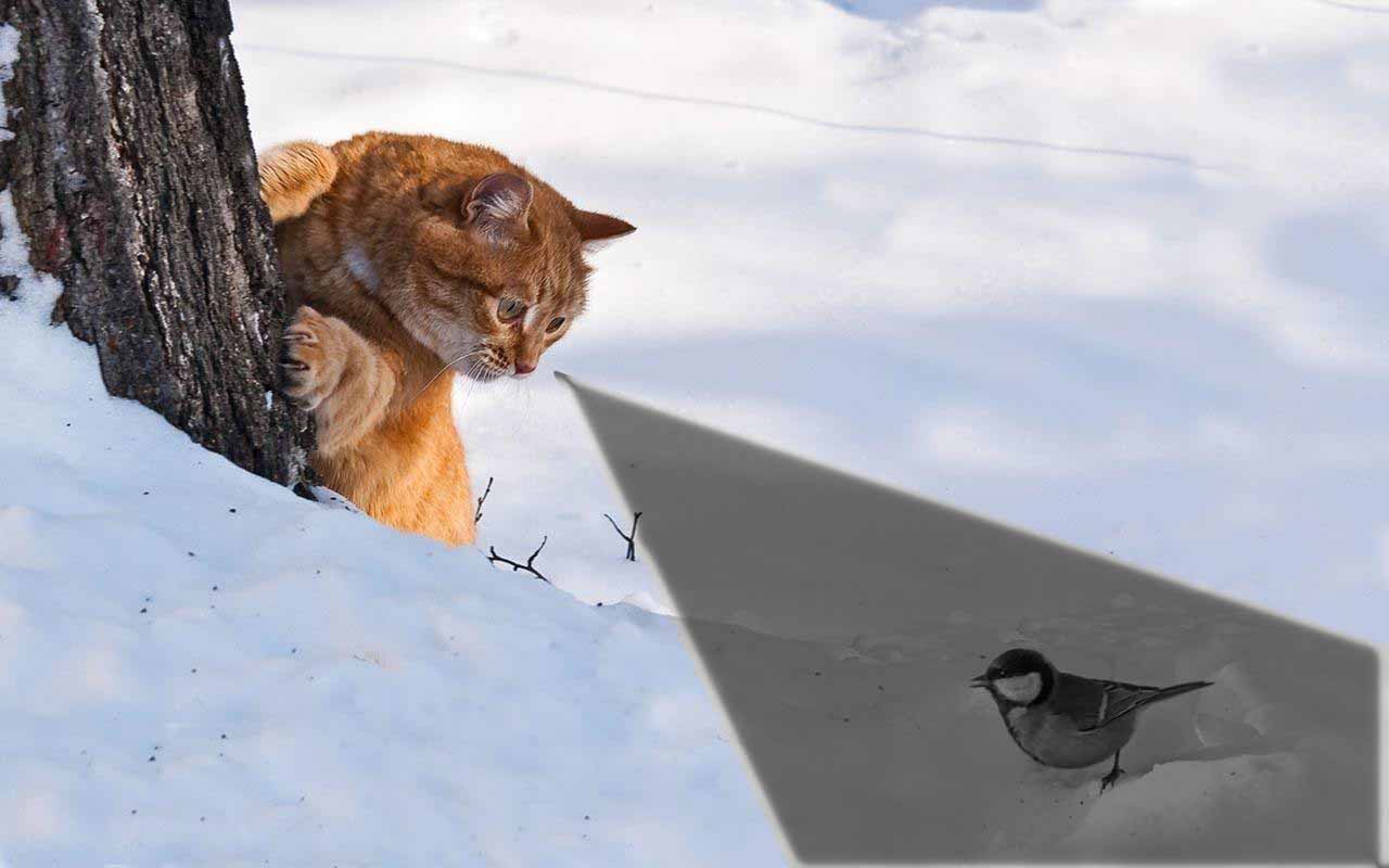Ночью серо-бурый грызун почти незаметен. Поэтому кошке, в свою очередь, пришлось «научиться» различать 25 оттенков серого. Это своего рода природный прибор ночного видения, настроенный на определение подвижной едва заметной цели. Так что ночью кошка видит мир черно-серым.