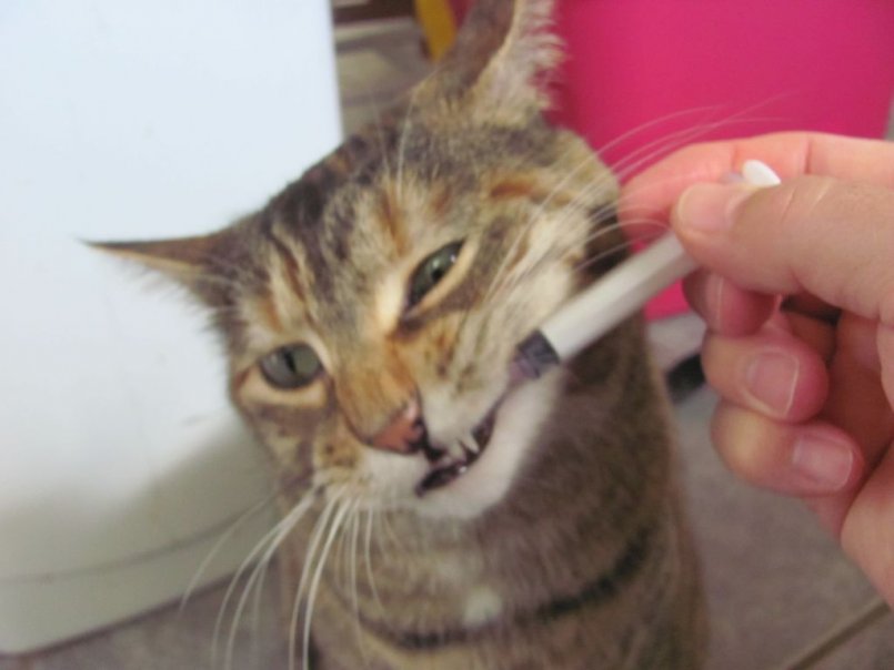 Давать средство в таблетированной форме питомцу нужно, положив его как можно дальше в пасть (оптимально – на корень языка). Если кот всячески отказывается от лекарства и еще больше начинает нервничать, вырываясь и прячась под кровать, можно прибегнуть к другому способу приема медикамента. Для этого таблетку нужно растолочь в порошок, развести его небольшим количеством воды и напоить этим раствором питомца с помощью шприца, с которого предварительно снята игла.