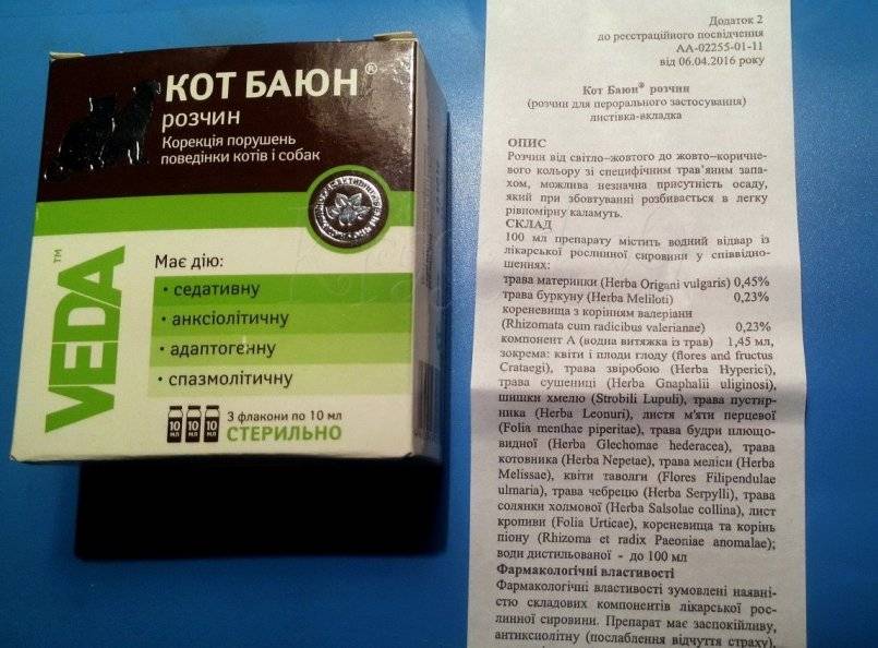 Представляет собой травяной отвар, содержащийся в небольшом пузырьке объемом 10 мл. Обладает мягким успокоительным действием, насыщает организм животного полезными веществами. Из-за специфического запаха препарата возникает проблема, связанная с тем, как лучше дать кошке капли «Кот Баюн». Рекомендуют просто смешивать с питьевой водой.