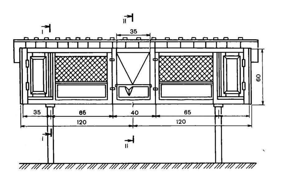 Когда размеры определены, можно приступать к чертежу. Начать следует с расчерчивания вида сверху: нарисовать прямоугольник требуемых размеров, при необходимости разделить на отсеки. Затем, на чертеже обозначаются все элементы: перегородки, двери, лазы, кормушки и пр. Везде проставляются размеры. На основе вида сверху чертится вид сбоку. Воображаемый разрез должен проходить через самое технологически сложное сечение, к примеру, по гнезду маточника. Размеры должны совпадать