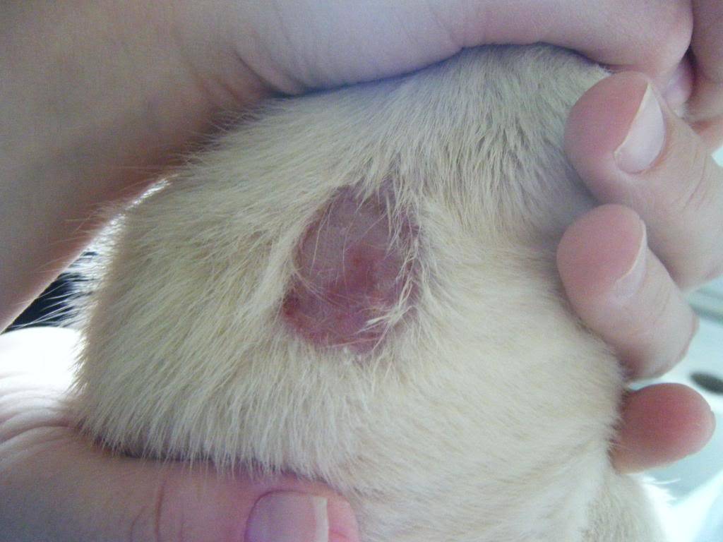 Происходит разрыв, жидкость вытекает, могут появиться гнойнички из-за инфицирования кожного покрова. Такой вид лишая лечится достаточно быстро, если терапия правильная. Пораженное место покрывается корочкой, после чего обновляются клетки, и вырастает новая шерсть.