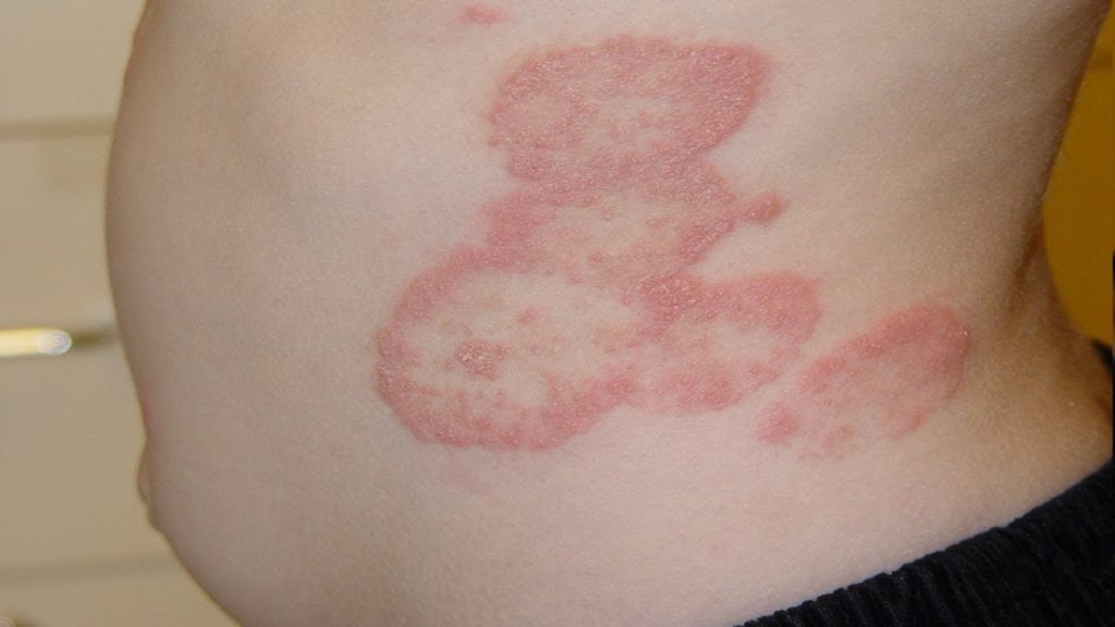 - место очага сильно шелушится и зудит, а кожа отпадает клочьями;