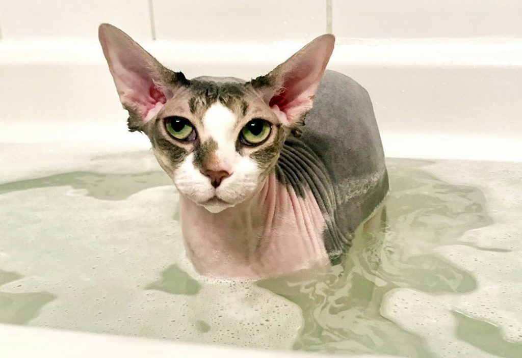 Сфинкса приучают к купанию с детства, но не все кошки любят эту процедуру