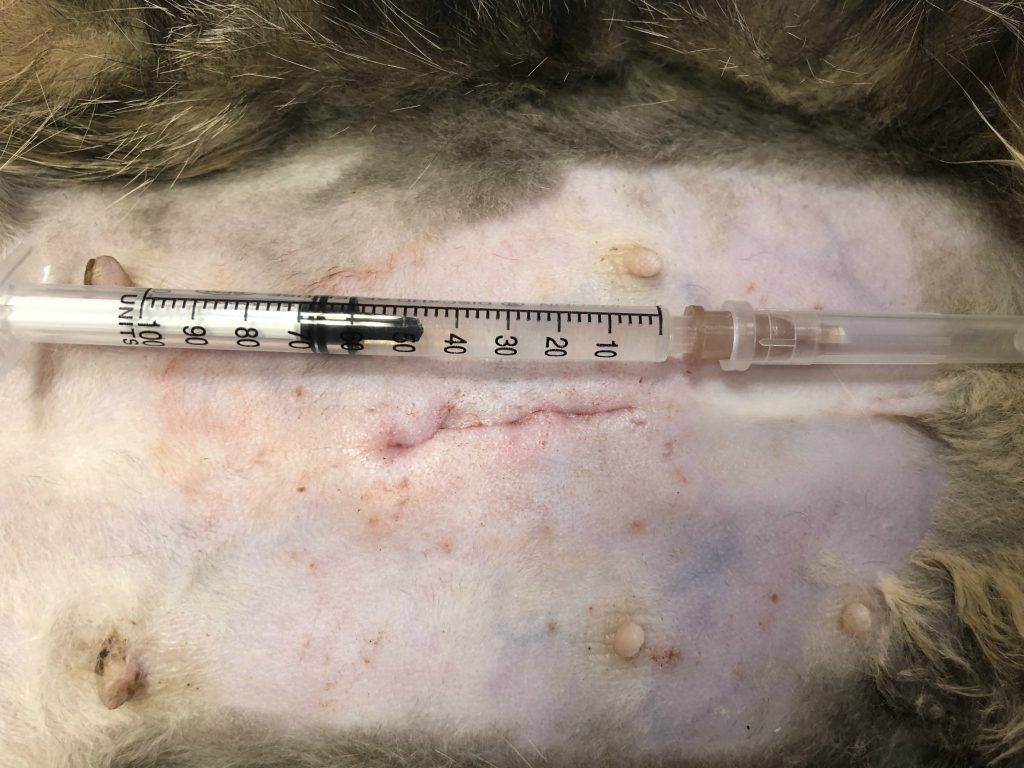 - Классический метод. Представляет собой рассечение кожи на предварительно подготовленном участке по белой линии живота немного ниже пупка. Длина разреза составляет около 3 см. Этот метод позволяет удалить и матку, и яичники. Его преимуществом является возможность прямого доступа специалиста к органам кошки. Недостатком считают большую длину шва, что может спровоцировать проникновение инфекции и развитие кровотечения.