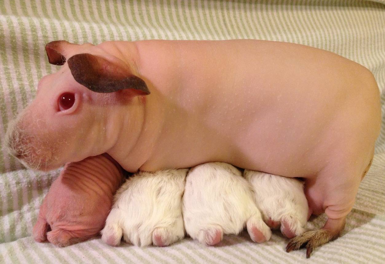 Первые голые хрюшки все были альбиносами, то есть у них были красные глаза и белая кожа. Но вследствие скрещивания удалось получить животных с различными цветами окраса кожи.