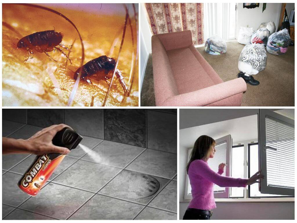Человек, обрабатывающий помещение, одевает защитную одежду, перчатки, очки, орошает инсектицидом поверхность пола, стен, обоев, мебели. Ковровые покрытия сворачивают. С особой тщательностью обрабатывают полки кладовок, балконов, пол под паласом. Оставляют помещение на указанное в инструкции по использованию инсектицида время. Проводят влажную уборку. Бельё и одежду стирают в горячей воде. Процедуру повторяют с интервалом в две недели.