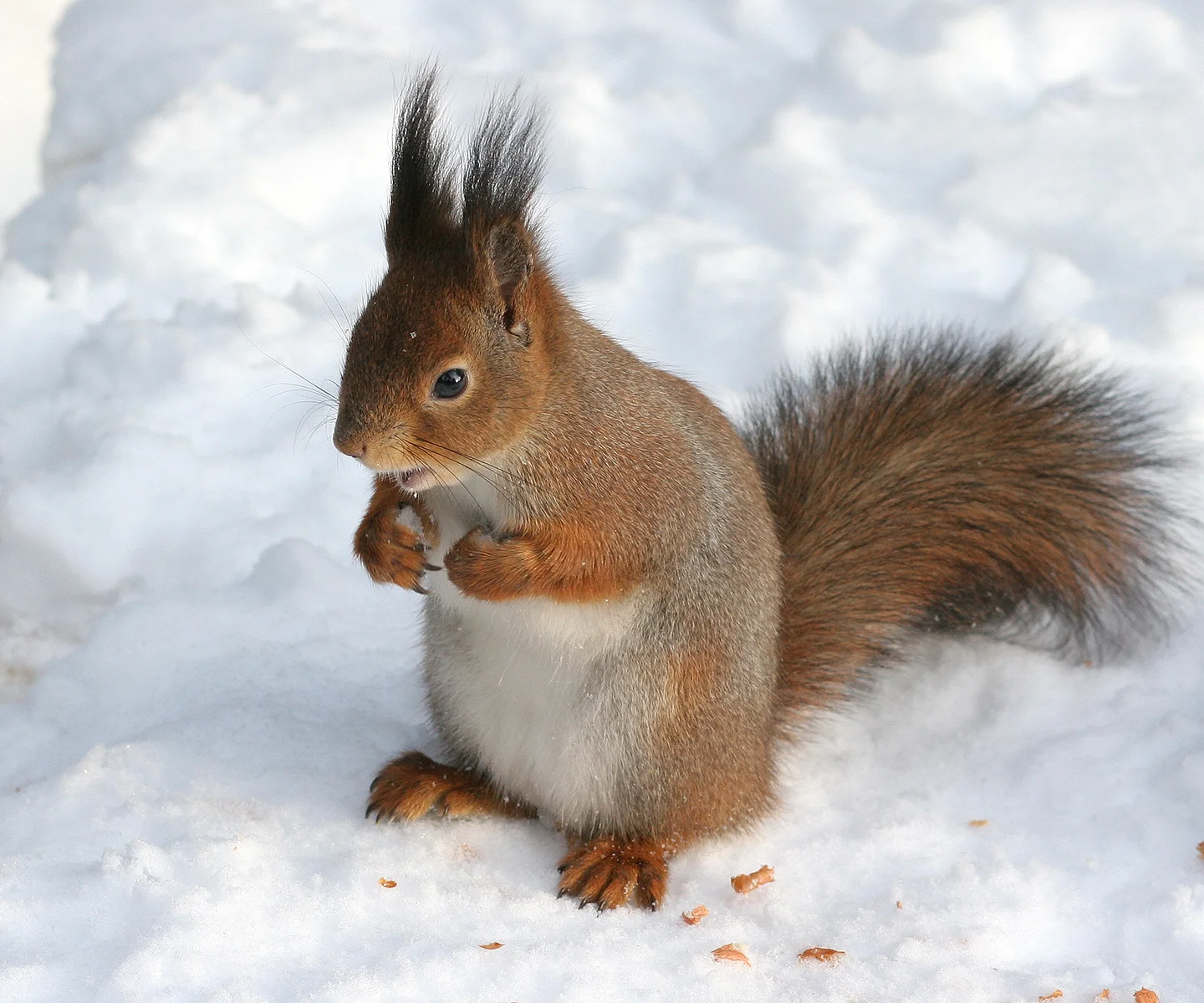 Что едят белки зимой? То же самое, что и в другие сезоны, только сушеное. Чтобы полноценно питаться, животные запасаются складывая еду в дупле или другое укромное местечко. Таких “заначек” может быть несколько, на случай разорения склада. Но и на месте зверек не сидит — постоянно ищет себе пропитание. Зимой они могут кушать даже шишки. Особенно, если ничего больше нет. Угощайте белочек почаще, особенно зимой. Делайте кормушки и приносите еду.