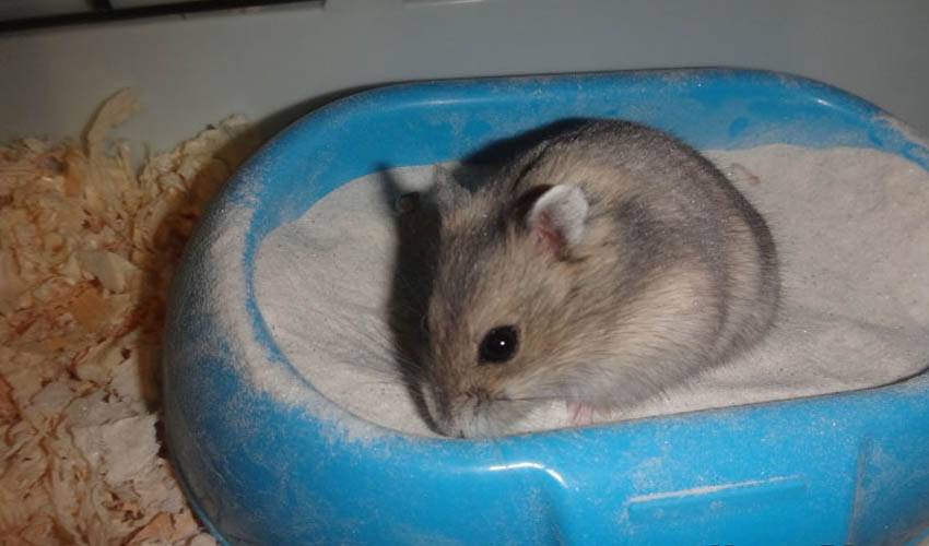 Песка именно для джунгарских хомяков в зоомагазинах нет, но отлично подойдет предназначенный для шиншилл: он не слишком крупный и не содержит частичек пыли.