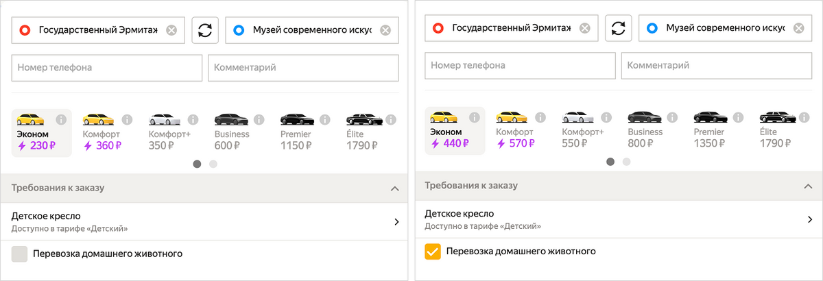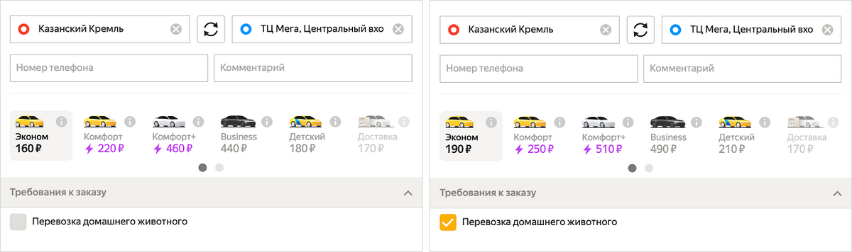 Такси. У популярных агрегаторов такси в требованиях к заказу можно добавить перевозку домашнего животного. В регионах поездка с собакой выходила на 30—50 Р дороже. В Санкт-Петербурге этот параметр увеличивает стоимость поездки почти в два раза.