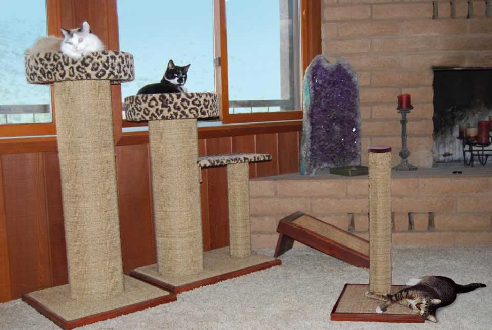 - Специальные приспособления. Котам надо точить свои коготки, поэтому лучше приобрести когтеточку и установить комплекс для лазания, чтобы сохранить мебель в целости.