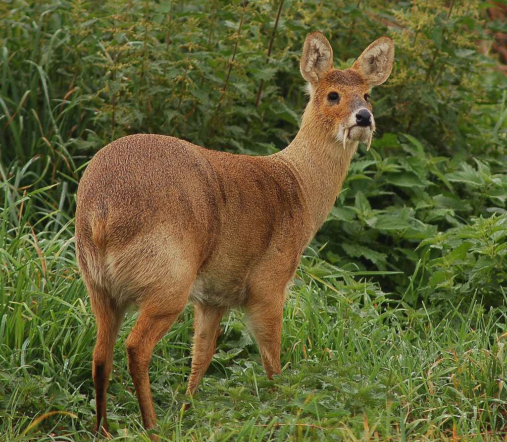 Является единственным видом, который представляет свой род. Рога у этих оленей отсутствуют. Величина их тела достигает 100 см в длину, масса составляет 15 кг, а рост 55 см. Встретить этих оленей можно в восточном Китае и Корее. Средой их обитания являются реки и озера, травянистые заросли. Окрас шерсти – буро-коричневый. Самцы имеют клыки, которые выступают на 5 – 6 см из-под верхней губы. Питаются растительной пищей (листья, трава, грибы).