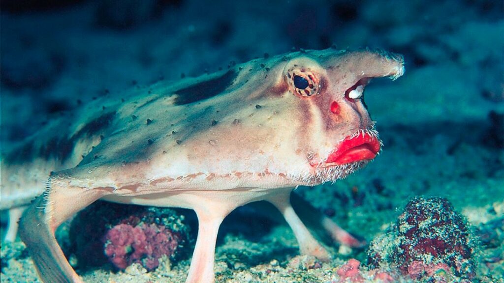 Отличительная черта – это губы ярко – алого цвета. Нетопырь Дарвина практически не плавает, а ходит по дну с помощью своих плавников.