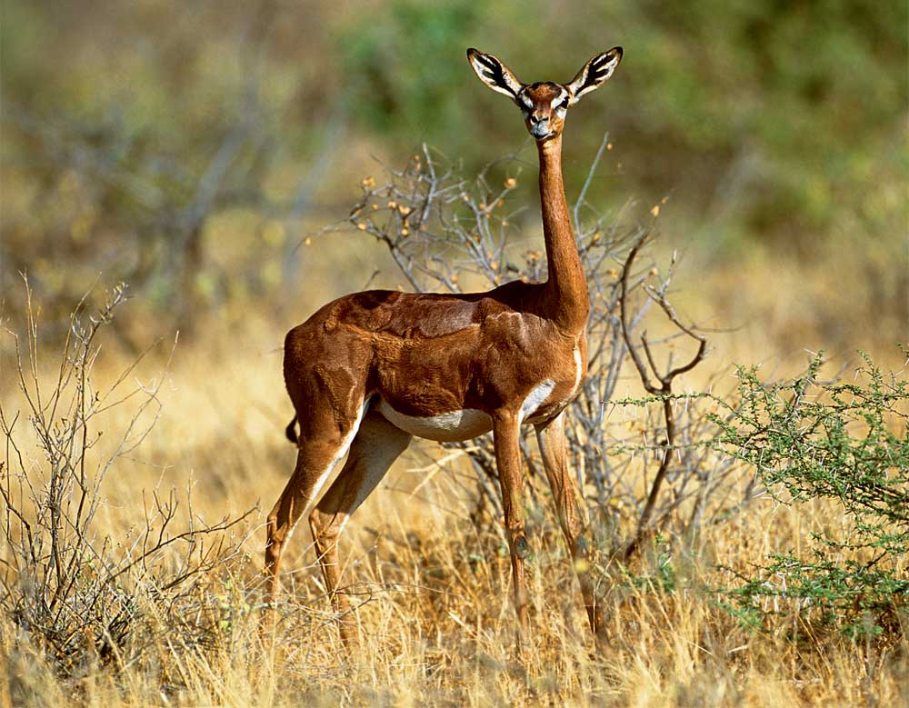 Еще одно название этого животного – «Жировая газель». Она относится к семейству антилоп. Высота тела Генерук достигает 95 см, а максимальный вес 52 кг. Самцы имеют рога,а у самок же эта часть тела отсутствует. Живут они в степях на территории Африки.
