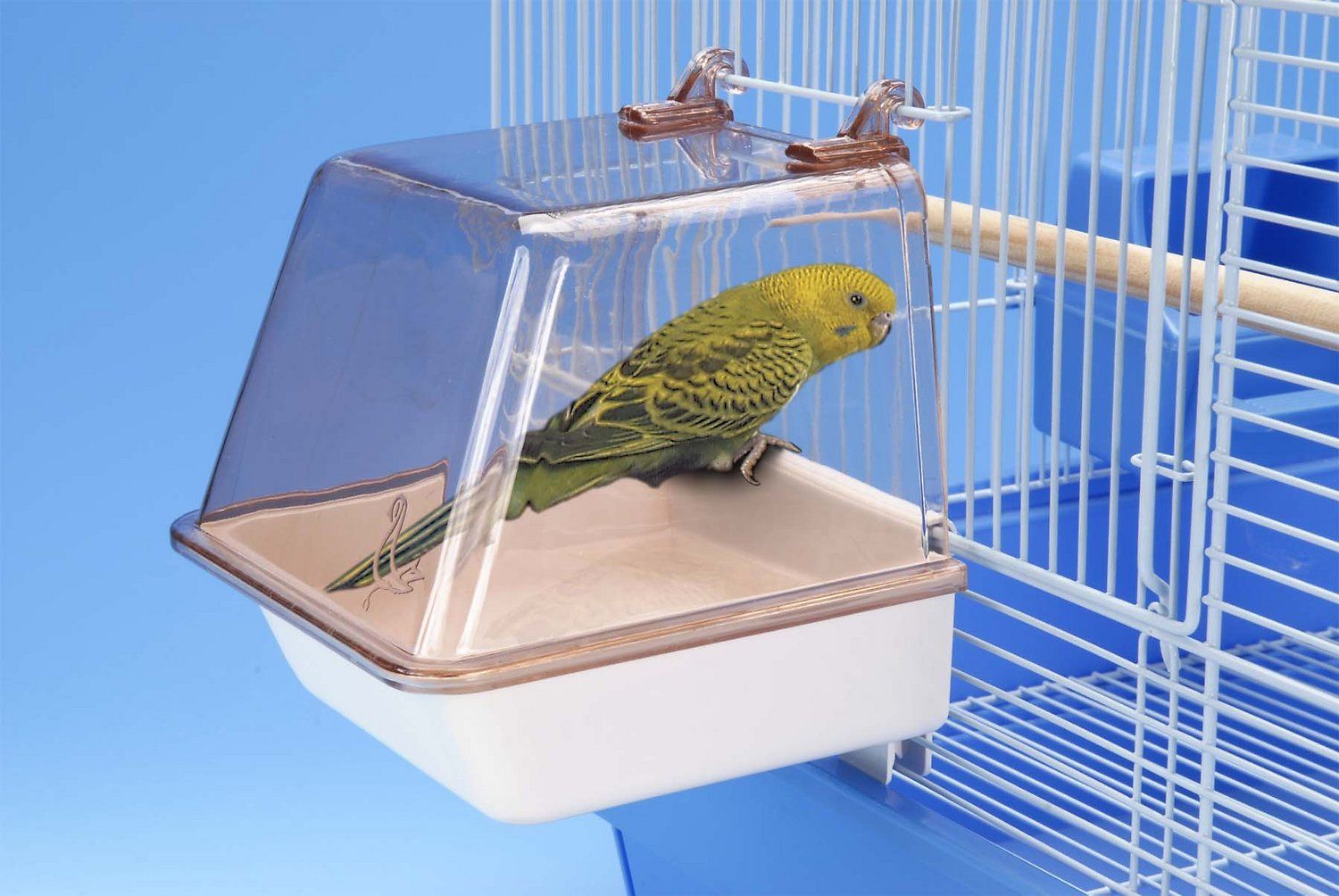 Водные процедуры пернатого могут проводиться в купалке. Ее продают в любом зоомагазине. Специальный контейнер крепят к дверце клетки. Лучшим вариантом считается купалка из пластика, она отличается легкостью и удобностью в использовании. Подойдет также изделие из органического стекла, минусом является его высокая стоимость.