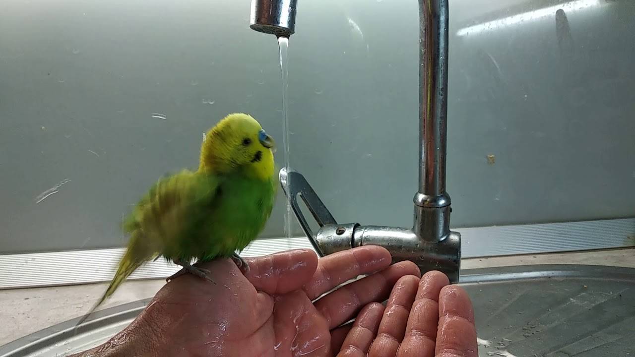 Чтобы приучить птицу купаться под краном, необходимо периодически на короткое время подносить питомца к нему, чтобы он смог привыкнуть к шуму воды, и только после этого подставлять его ближе к струе.
