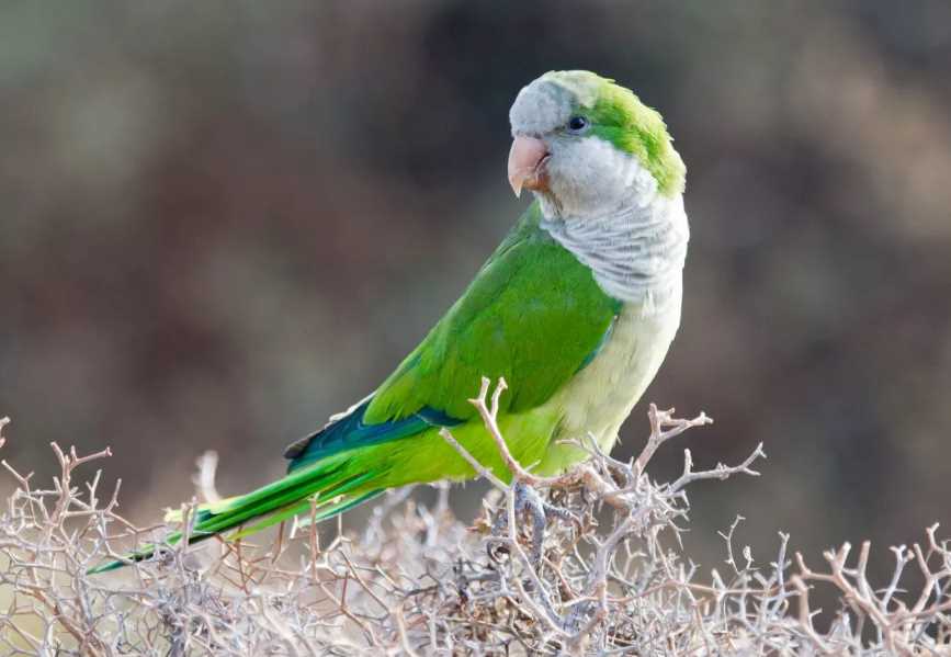Попугай-монах – небольшая птичка, рост которой не больше тридцати сантиметров, их вес не превышает ста пятидесяти граммов. Окрас перьев не очень яркий: спина, крылья и ступенчатый длинный хвост окрашены зелёный цвет, а расцветка щёк, лба и животика чаще всего серая. Попугай-монах, имеющий второе название квакер, имеет закруглённый клюв цвета соломы.