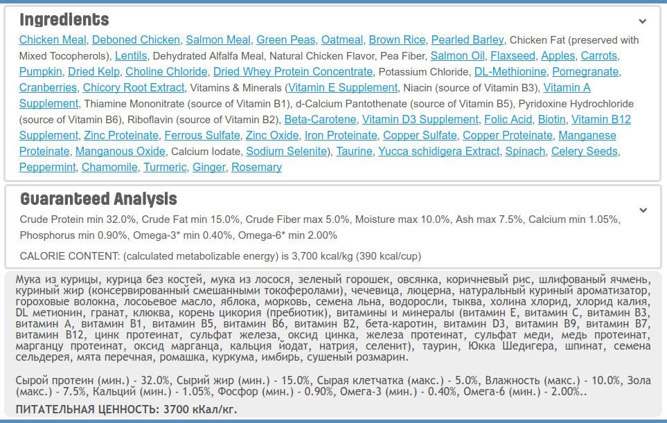 Корм соответствует рекомендациям AAFCO, это значит что ингредиенты типа «курица» в основном состоят из мяса курицы и могут немного содержат кожу и кости. Однако на официальном сайте отмечается, что «мука из курицы» костей не содержит.