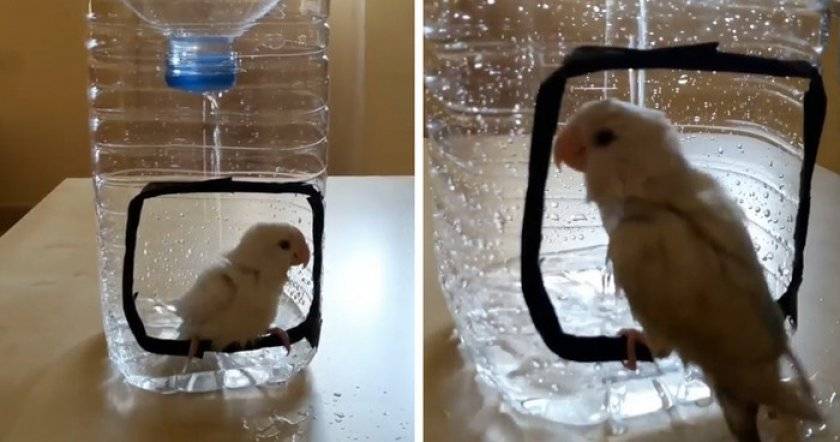 Простую купалку для маленьких и средних попугаев вполне реально сделать собственными руками. Каких-то специфических навыков здесь не потребуется. В качестве ключевого компонента можно использовать обычную 5-литровую бутылку из-под воды – квадратную или округлую.