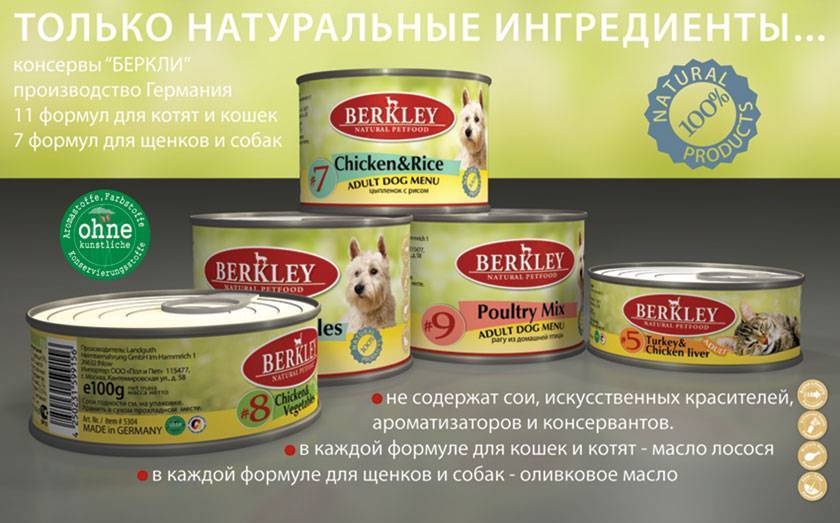 В целом консервы Беркли являются отличным дополнением к сухому корму, а также прекрасной альтернативой натуральному рациону – в консервы уже добавлены витамины, аминокислоты, а показатели фосфора и кальция соответствуют норме. А нравится ли Беркли вашим хвостикам?