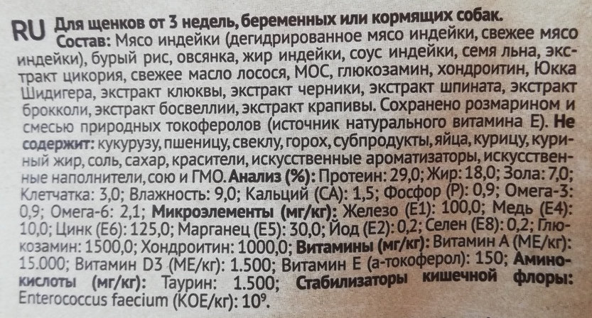 На первом месте — мясо индейки, выступает источником белка. Процент этого ингредиента не указано, но уточнено, что в него входят дегидрированное мясо индейки и свежее мясо индейки. Поскольку других богатых белком ингредиентов в составе нет, можно быть уверенным, что основная часть из указанных в анализе 29% протеина — животного происхождения.