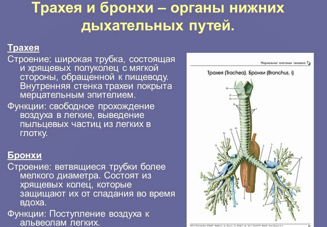 Кроме того, трахея обладает вибрирующими ресничками, которые помогают удалять пыль и другие частицы из дыхательных путей, препятствуя их попаданию в легкие. Таким образом, трахея выполняет важную функцию в организме человека, обеспечивая надлежащее увлажнение и очистку вдыхаемого воздуха.