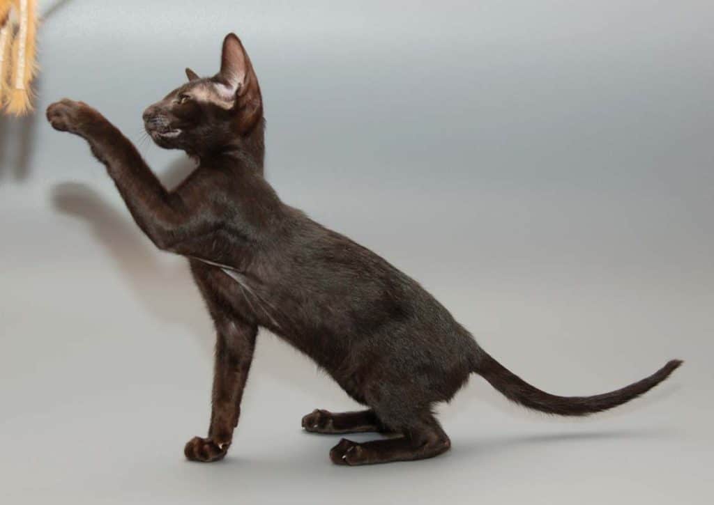 Ориентальная кошка обладает дружелюбным и игривым нравом. На протяжении всей жизни она остается очень подвижной. Питомец никогда долго не сидит на месте. Он часто взбирается на шкафы, комоды, подоконники, поэтому разбитые цветочные горшки и вазочки – обычное явление для хозяина ориентала.