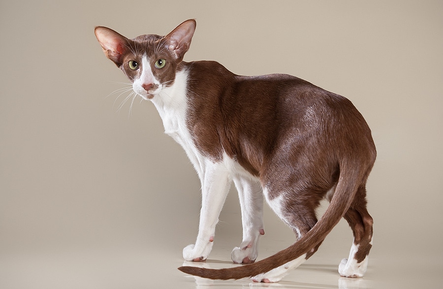 Ориентальная кошка имеет стройное, но мускулистое тело с удлиненными конечностями. Это придает ей изящный и элегантный внешний вид. Хвост ориентальной кошки одинаково длинный и заостренный, у кошки миниатюрные лапки. В целом они выглядят как очень легкие и подвижные животные, а их движения завораживают.