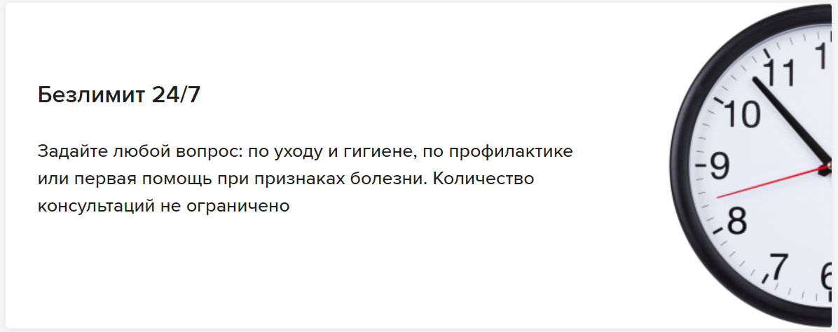 - Безлимит 24/7. Вы получаете безлимитное количество обращений по поводу гигиены, профилактики или болезней вашего питомца. Как минимум, такого я еще нигде не видел (или описывалось это иначе), поэтому определенно плюс.