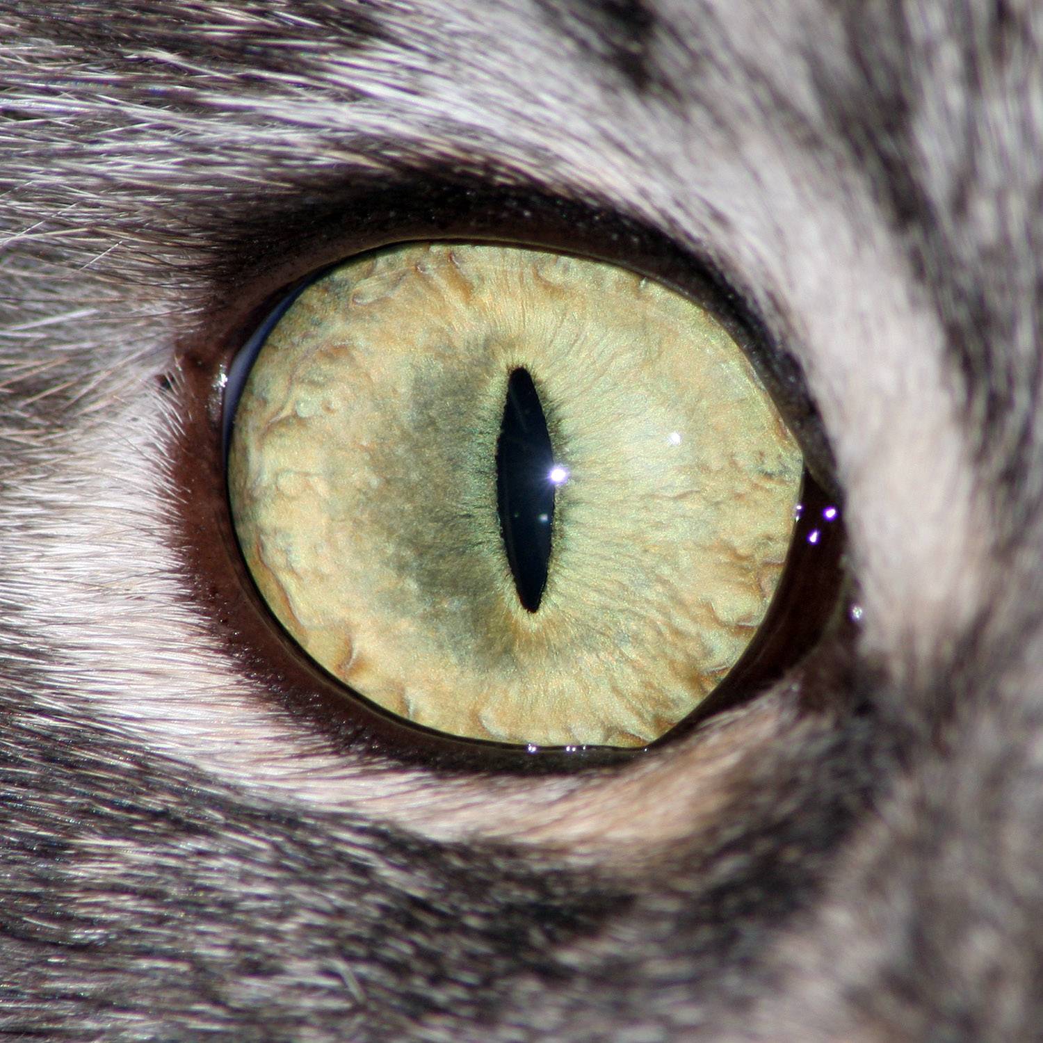 Кошачий глаз по отношению к общей площади тела просто огромен. Кроме того, эти глаза обладают большим углом обзора — 270°, имеют эллиптическую форму, большую роговицу и отражающий слой на глазном яблоке. Этот слой в состоянии менять длину волны фотона, корректируя её таким образом, что кот может хорошо видеть предметы в темноте (ему достаточно десятой части освещения, которое считается нормальным для человека). Палочек (элементов сетчатки), благодаря которым мы можем видеть при слабом свете, у человека в шесть раз меньше, чем у кота.