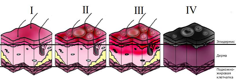 - поражение всех трех слоев кожи (четвертая степень).