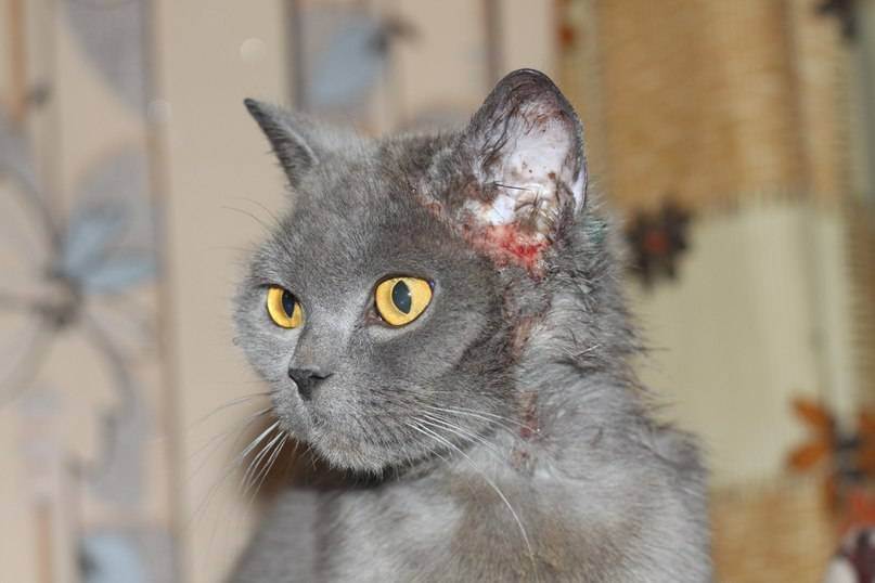 Беспокойство и зуд в области уха иногда появляется в результате ушиба. Сильный удар о твердую поверхность приводит к разрыву кровеносных сосудов в ухе. Кровь попадает в пространство между хрящом и кожей, образуется припухлость, сопряженная с сильной болью. У кошки дергается ухо, она старается почесать больное место.