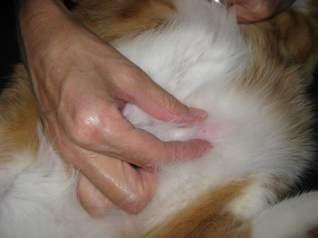 Если шишка на животе прорвалась – окажите первую помощь, обработав ее антисептиком без спирта, и обязательно отнесите кошку к врачу.