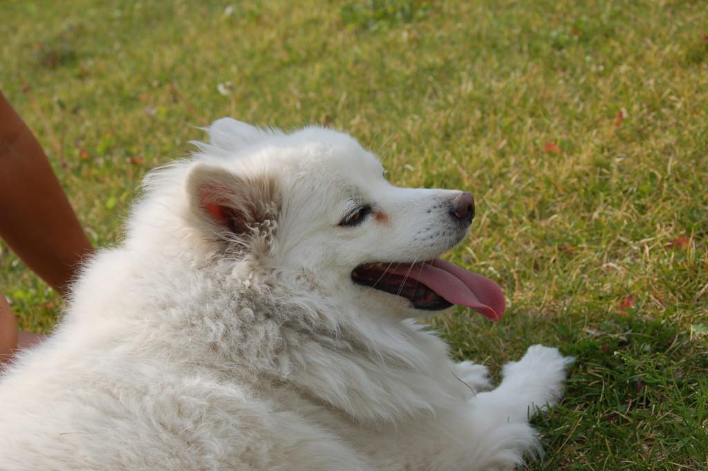 Хвост у собаки красиво закручен набок, он покрыт длинной и красивой шерстью. Белоснежная шерсть американского эскимоса действительно гордость собаки и его хозяина. Ухаживать за ней нужно обязательно, хотя бы раз в неделю, расчесывая своего питомца. Сама по себе шерсть не притягивает грязь, поэтому и купать нужно реже.