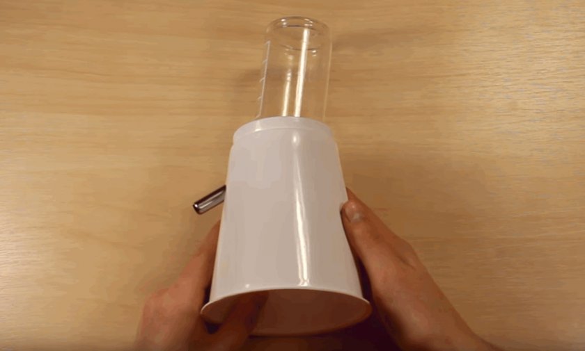 Зафиксировать автопоилку можно и с помощью большого пластикового стакана. Для этого он переворачивается донышком вверх, и в нем вырезается отверстие для поилки. Сбоку необходимо проделать уже маленькое отверстие, в которое просовывается трубочка. Конструкция достаточно устойчиво размещается внутри клетки, ее можно поставить в любое свободное место.