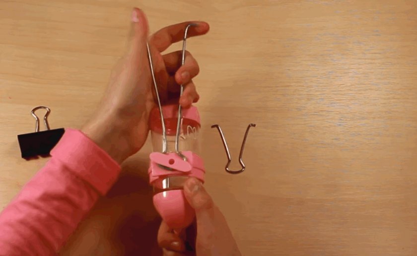 - Если у вас поилочка с отверстием в крышке для крепления, то достаточно сделать из кусочка проволоки двухсторонний крючок. С одной стороны петельку делаем побольше для крепления за край клетки или контейнера, а с другой стороны на маленькую петельку цепляем поилочку.