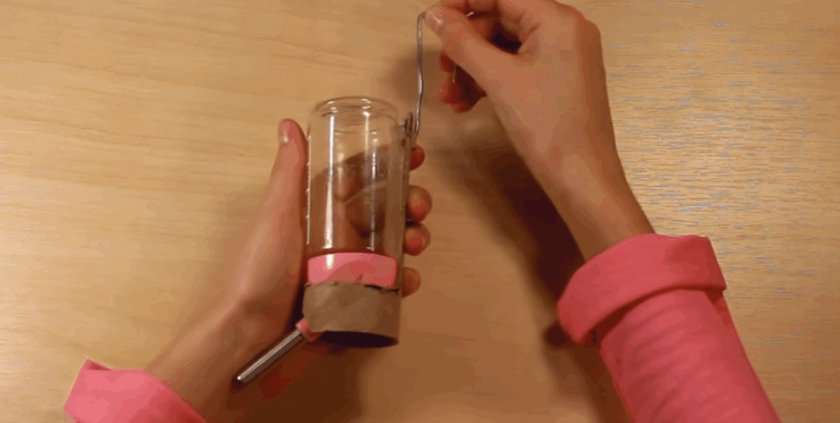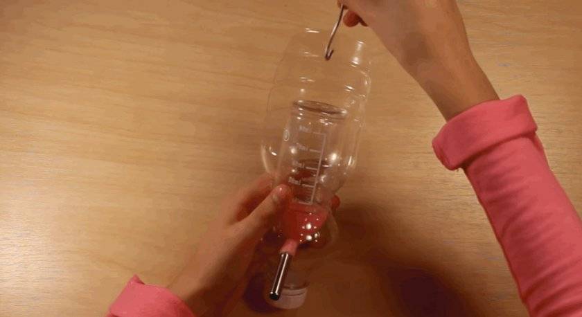 - Далее понадобится наполнить емкость водой, закрутить крышку и прикрепить поилку к клетке, используя проволоку или веревку. Расположение должно быть таким, чтобы кончик трубочки находился в воздухе на высоте, комфортной для животного.