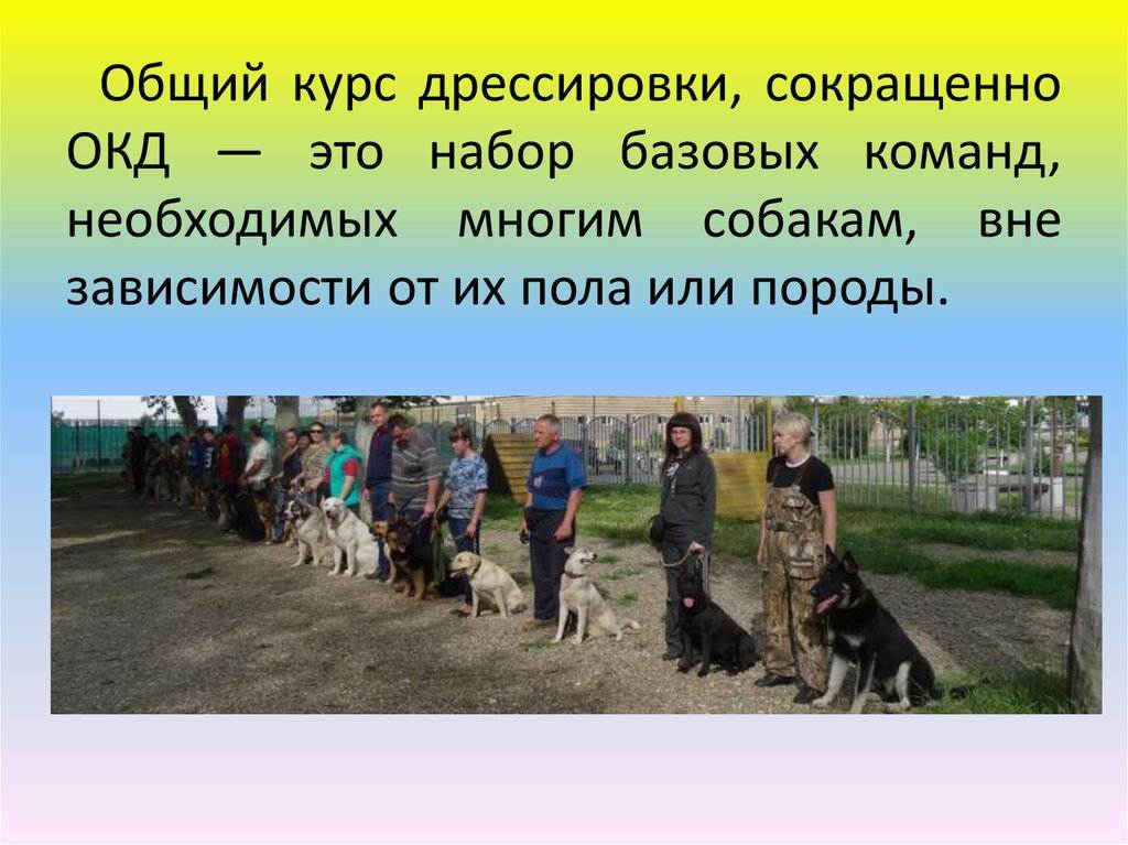 Общий курс дрессировки (ОКД) был разработан советскими кинологами около века назад. Это школа, которая позволяет скорректировать поведение собаки и воспитать в ней безоговорочное послушание. Жесткие требования, которые предъявляются в ходе курса к каждой собаке, признаны базовыми, а степень владения нормативами проверяют на всех специализированных конкурсах.