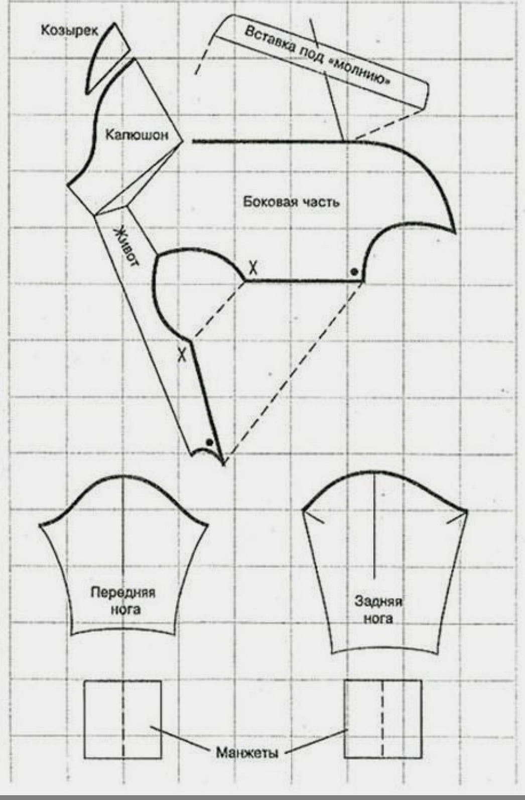 На этом пошив комбинезона можно считать законченным. На бумаге должны быть спинка, грудина, шея, живот и, если предусмотрен, капюшон. В зависимости от одежды (дробная или цельная), брюки могут быть раздельными или вшитыми. Возможно даже не брать для них отдельный кусок ткани.