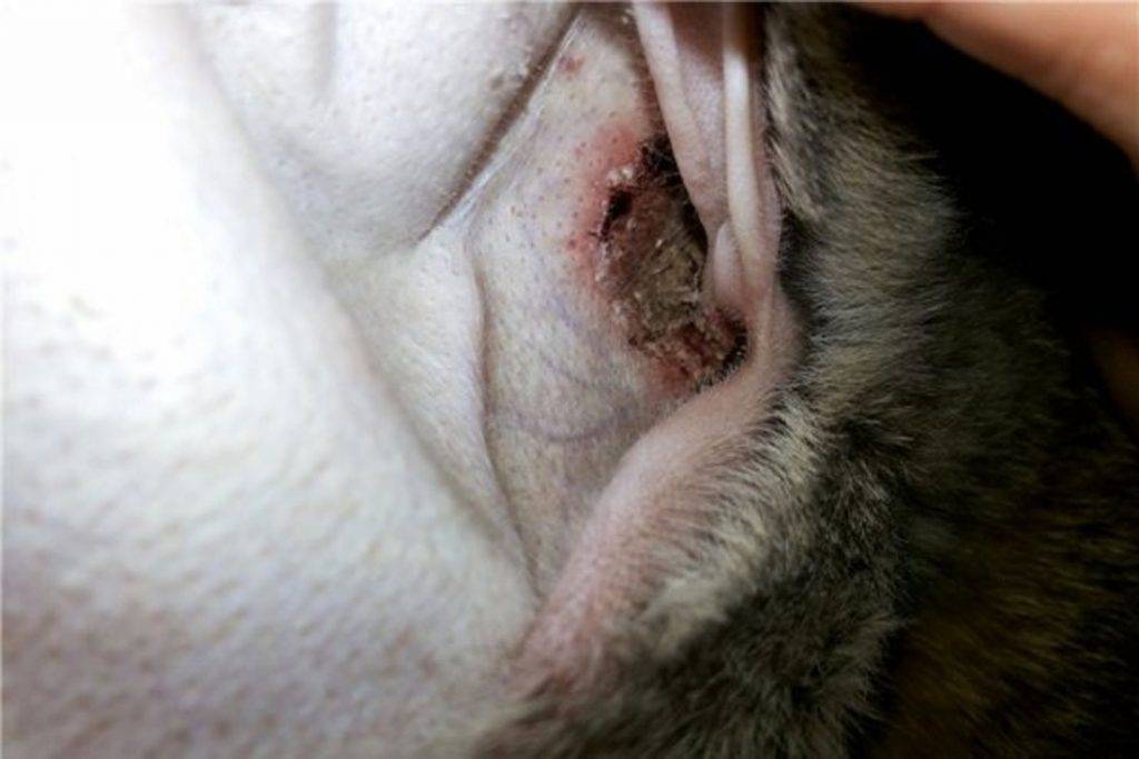 Признаки заболевания можно обнаружить визуально. Уши становятся более толстыми и горячими, покрываются корочкой коричневого цвета. Лечение довольно простое, но иногда требуется повторный курс медикаментов.