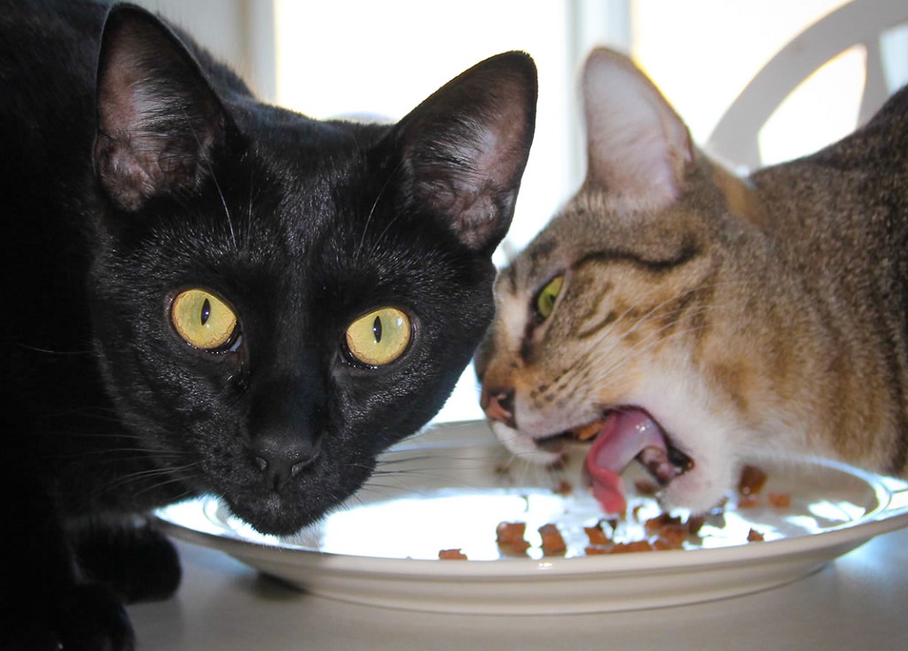 Часто метеоризмом страдают кошки, которые очень жадно и много кушают. При этом они заглатывают корм, не жуя его, что приводит к попаданию в кишечник и желудок большого количества воздуха. В итоге кишечник может раздуться до невероятных размеров. Обычно так жадно едят сами животные, которые живут в приютах или питомниках.