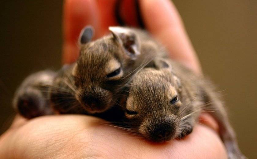 Важно! Родственные связи приводят к ослаблению иммунитета у молодняка и вырождению породы в дальнейшем. Первые две недели новорожденные дегу вскармливаются матерью, после чего в течение нескольких недель их постепенно переводят на взрослую пищу
