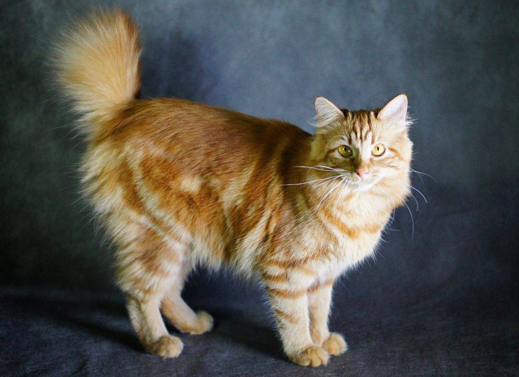 Карельский бобтейл – это аборигенная порода кошек родом с Карельского перешейка, впервые обнаруженная возле Ладожского озера. Стандарт породы был закреплен в 1987 г. в Санкт-Петербурге. Отличительная черта – короткий изломанный хвост, который выглядит как помпон. Такая особенность обусловлена генетической мутацией, передающейся из поколения в поколение. По размерам кошка некрупная, задние лапы намного длиннее передних.